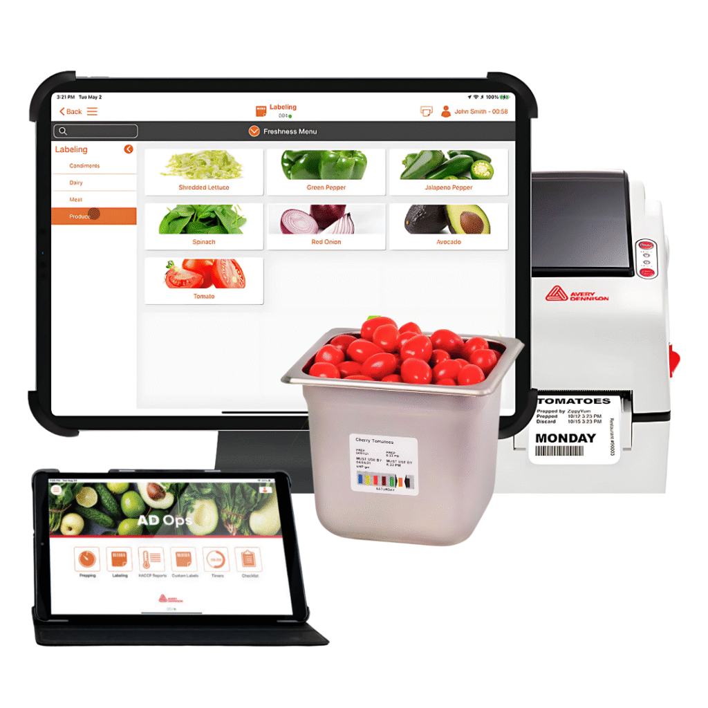 The 9442 AD Go Ops Tablet System includes a 10.1″ screen tablet and a 2″ Avery Dennison 9442 Direct Thermal Printer with Freshmarx Prep Software. This compact and portable Tablet System supports label printing of a wide variety of label formats, designed specifically for your restaurant or kitchen and facilitates tasks such as nutritional calculation and temperature tracking to improve food safety. This intelligent solution is certain to solve all your food labelling needs and become extremely invaluable within your business.